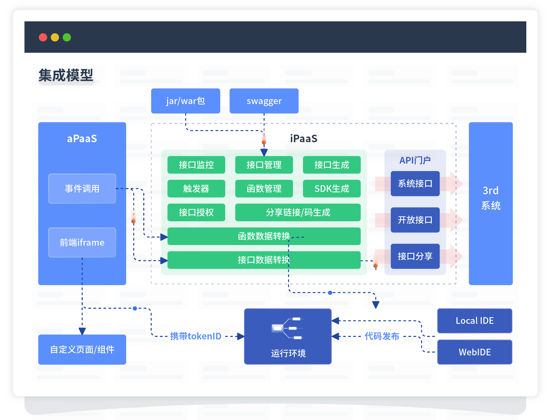 集成模型包括平台本身前、、后端能力的扩展,,,也支持通过API门户和第三方系统进行交互。。