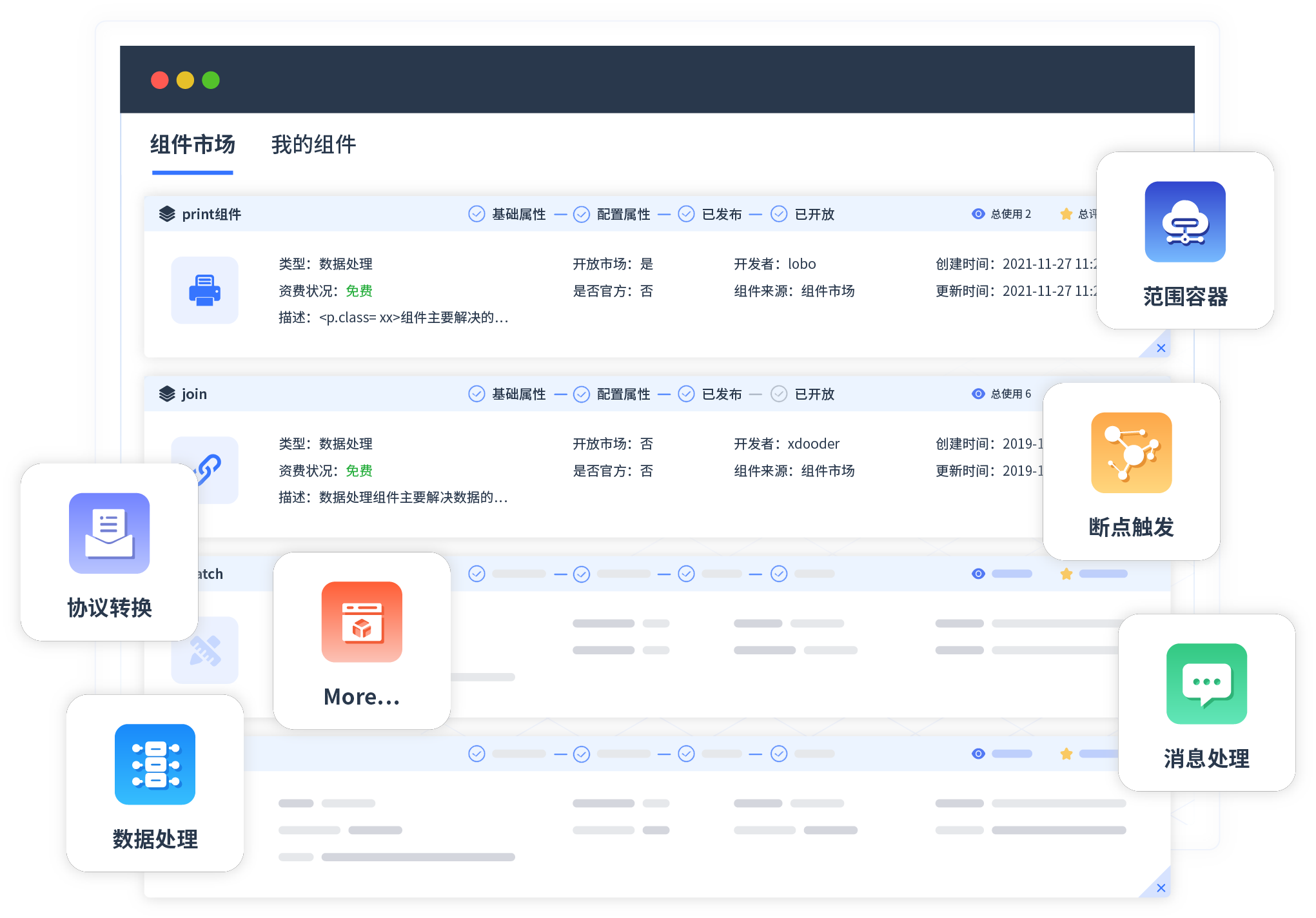 针对集成场景,,,NO钱包提供组件市场,,,例如协议转换、、、、消息处理、、文件操作等。。除平台提供的组件外,,,客户可以自定义所需组件。。。