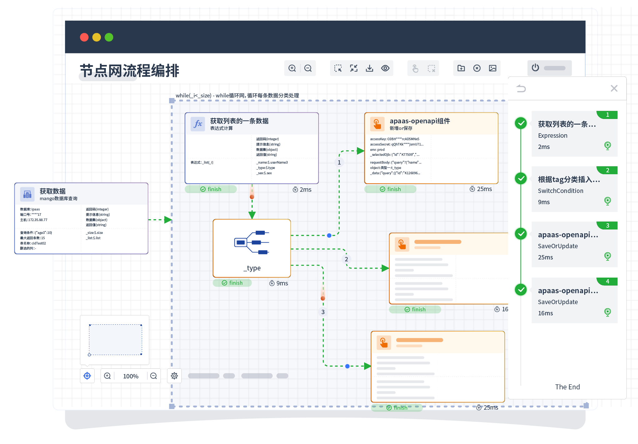 针对集成场景,,,,组件定义后支持进行流程编制,,,不同于传统代码方式,,,通过图形化展示,,支持在线调试、、、日志查看和运行回放。。。。